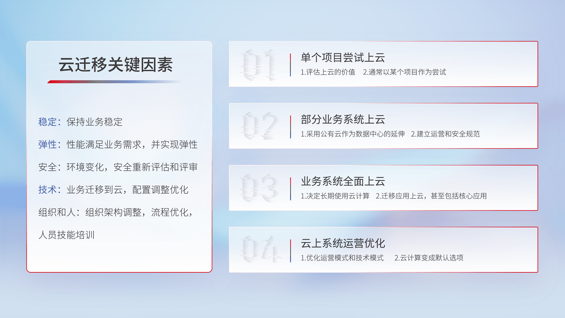 结合实际业务,,从规划设计、、云平台选型、、、云原生改造、、、、数据迁移、、集成交付,,,,迁移全过程为客户识别最佳上云路径,,,,做好风险识别管理,,,设计网络架构、、、、身份权限、、、、安全审计合规、、、操作审计、、日志审计、、、监控告警策略、、、、多站点容灾设计等,,对云上基础设施进行整体规划,,,,提升IT治理水平,,以满足弹性、、、、高可用、、高性能的需求。。