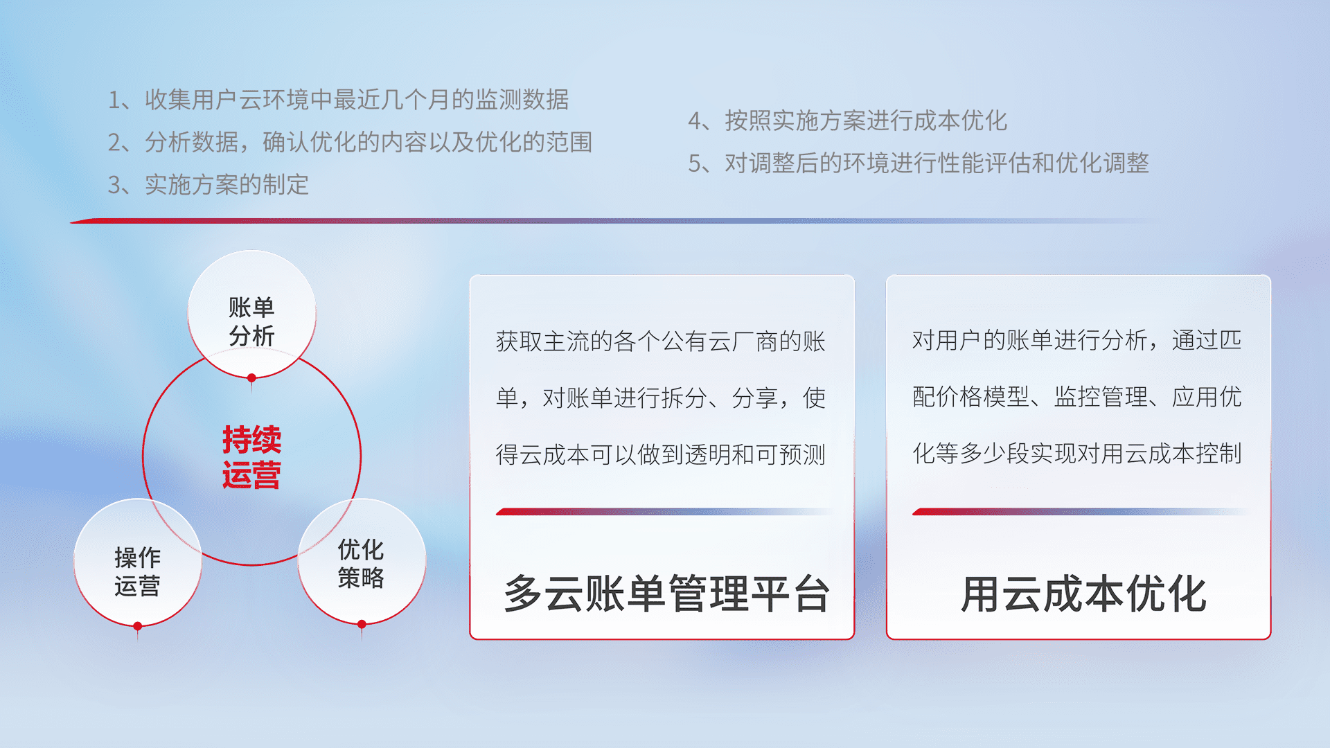 通过多云纳管,,,,以统一的资源数据模型把客户的云资源进行抽象和封装,,,进而实现对多云资源的统一操作,,,,保障云资源管理的可靠性、、、稳定性与可用性。。。量身定制化运维内容,,配置、、、、开发运维、、、、补丁管理、、、备份、、、监控、、认证和访问管理、、审计和日常巡检等,,,保障在用云过程中的可靠度,,稳定度以及高可用率。。